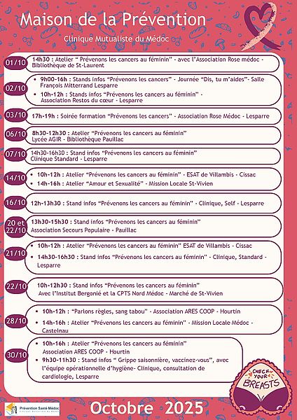 En octobre, la Maison de la Prévention de la Clinique Mutualiste du Médoc poursuit ses actions de sensibilisation notamment en faveur de la santé des femmes avec un focus sur la campagne d'Octobre rose, mois de lutte contre le cancer du sein.