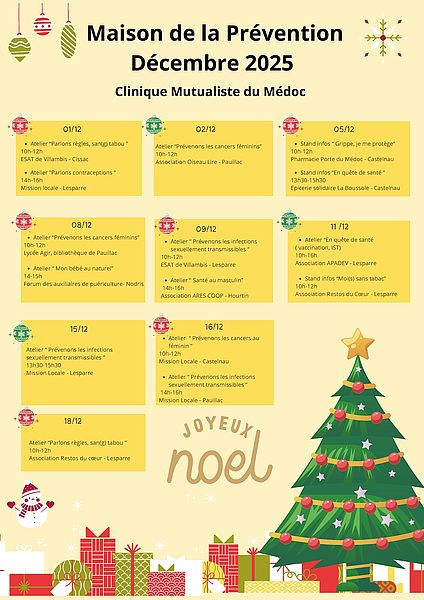 En décembre, la Maison de la Prévention de la Clinique Mutualiste du Médoc poursuit ses actions de sensibilisation notamment avec un focus sur la prévention des cancers féminins, les infections sexuellement transmissibles ou encore la vaccination contre la grippe.